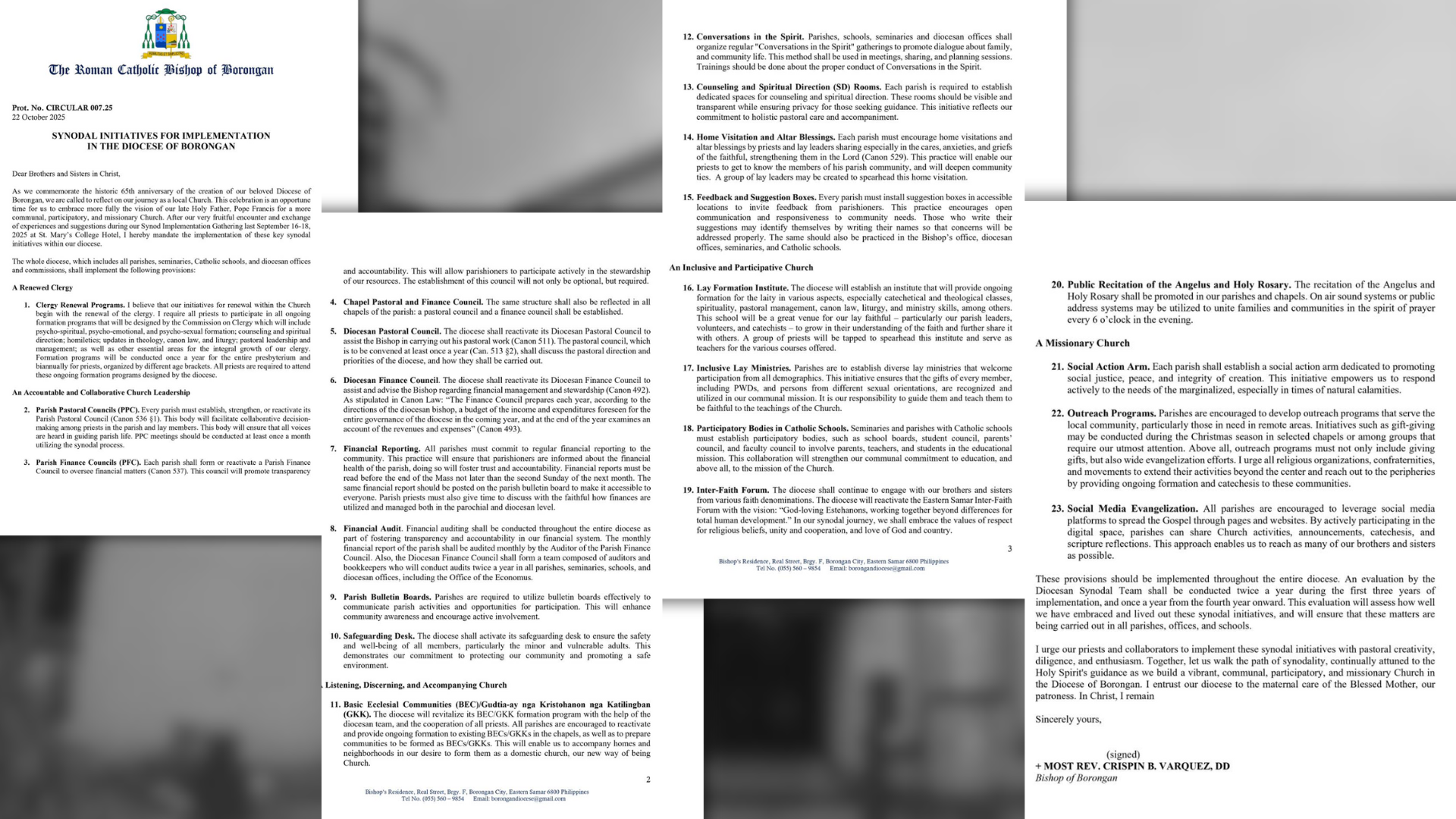 Inatasan din ng obispo ang lahat ng parokya na ipahayag sa misa at ipaskil sa bulletin board ang taunang financial report upang maging mas bukas ang ugnayan ng simbahan at mamamayan.