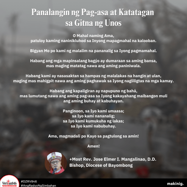 Dalangin ni Bishop Mangalinao ang katatagan at kaligtasan ng lahat upang makabangon muli sa mga nararanasang pagsubok, at patuloy na magtiwala sa kalooban ng Diyos na Siyang magbibigay-lakas at magliligtas sa kabila ng mga panganib.