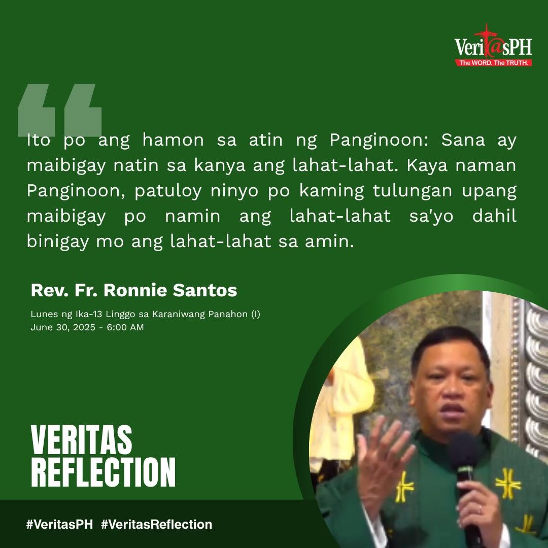 #VERITASREFLECTION: “Tulad ng pagbibigay ng Panginoon ng buo niyang atensyon sa atin, nararapat din na ating itong igawad sa kanya. Ating ibigay sa Dakilang Diyos ang ating lakas, pananampalataya at atensyon upang tayo’y pagpalain pang lalo. Alisin natin sa ating sistema ang mga bagay na hindi nakalulugod sa kanyang kaharian at mga bagay na nagpapalayo ng ating relasyon sa Kanya.”