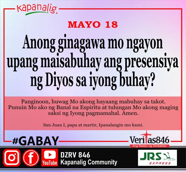 551 total views Miyerkules sa Ika-6 na Linggo ng Pasko ng Pagkabuhay MASS PRESIDER: Rev. Fr. Joel Saballa, CFIC [fb_plugin video href=https://www.facebook.com/DZRV846/videos/1399567017486838] [give_form id=”72114″ show_title=”true” show_goal=”false”