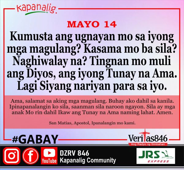 447 total views Ika-6 na Linggo ng Pasko ng Muling Pagkabuhay (A) MASS PRESIDER: Rev. Fr. Raymond Tapia, BFP-CHS [fb_plugin video href=https://www.facebook.com/DZRV846/videos/1314540132803744] [give_form id=”72114″ show_title=”true” show_goal=”false”