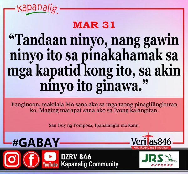 604 total views Sabado sa Ika-5 Linggo ng Apatnapung Araw na Paghahanda MASS PRESIDER: Rev. Fr. Vhong Turingan [fb_plugin video href=https://www.facebook.com/DZRV846/videos/3052631601697187] [give_form id=”72114″ show_title=”true” show_goal=”false” show_content=”none”