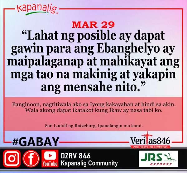 1,537 total views Miyerkules sa Ika-5 Linggo ng Apatnapung Araw na Paghahanda MASS PRESIDER: Rev. Fr. Arnold Layoc [fb_plugin video href=https://www.facebook.com/DZRV846/videos/1065811744442137] [give_form id=”72114″ show_title=”true” show_goal=”false” show_content=”none”