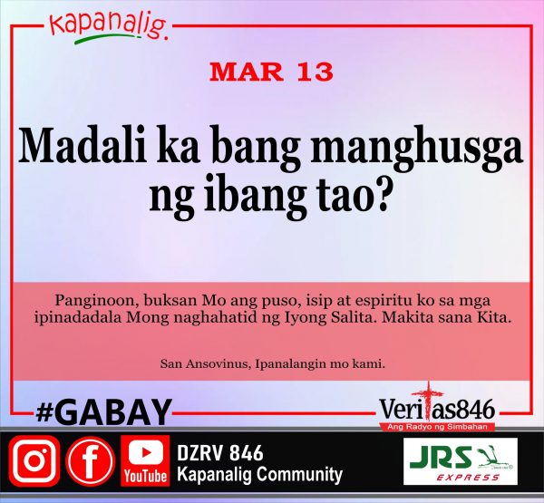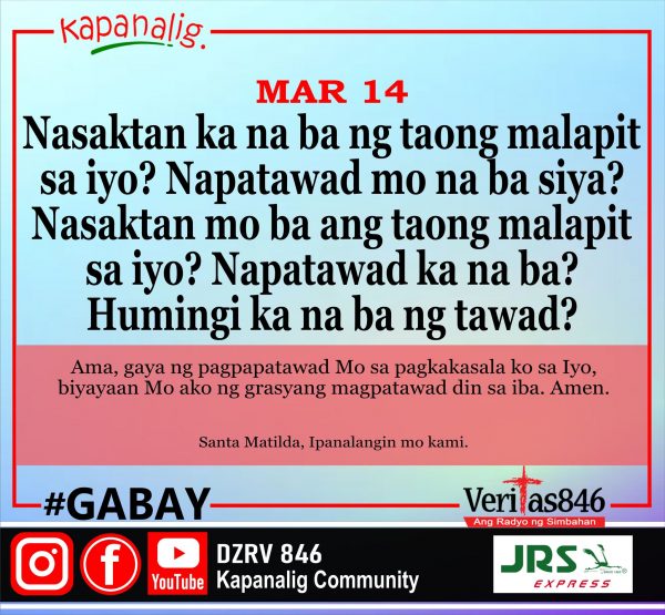 449 total views Lunes sa Ika-3 Linggo ng Apatnapung Araw na Paghahanda MASS PRESIDER: Rev. Fr. Christopher Labrador, OCARM [fb_plugin video href=https://www.facebook.com/DZRV846/videos/1430020374496254] [give_form id=”72114″ show_title=”true” show_goal=”false”