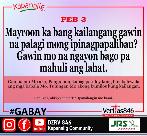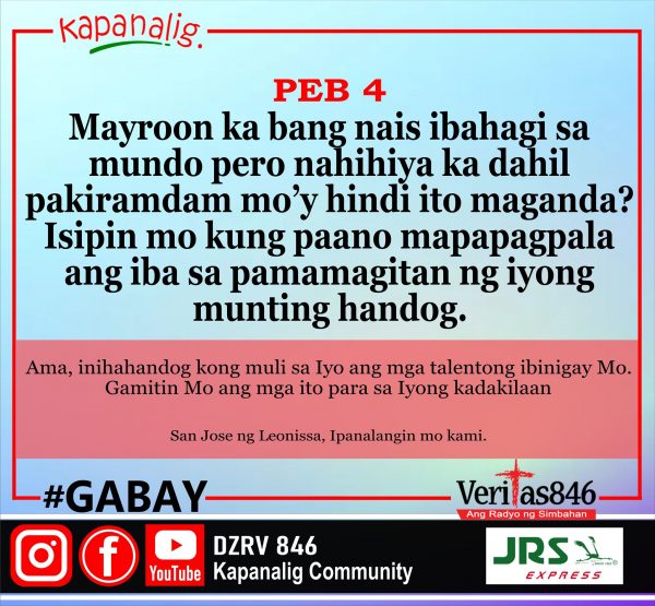 586 total views Ika-5 Linggo sa Karaniwang Panahon (A) MASS PRESIDER: Most Rev. Antonio R. Tobias, D.D. [fb_plugin video href=https://www.facebook.com/DZRV846/videos/706172130991527] [give_form id=”72114″ show_title=”true” show_goal=”false” show_content=”none” display_style=”onpage”]