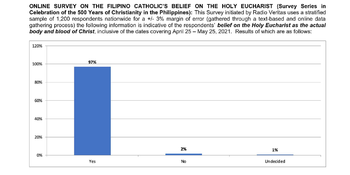 “Maganda yung resulta ng survey na 97-percent sa mga Filipino Catholics ang naniniwala sa Real Presence, na talagang si Hesus ang nasa Blessed Sacrament,” pahayag ni Bishop Pabillo sa panayam ng Radio Veritas.
