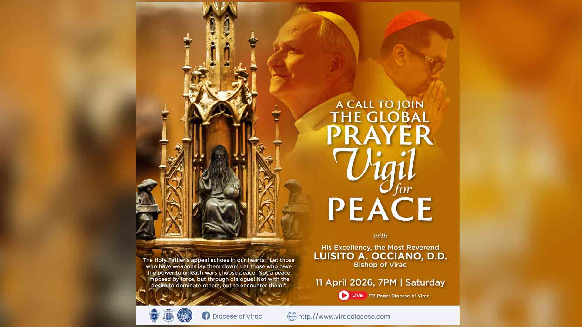 Hinimok din ni Bishop Occiano ang lahat ng parokya at mission churches sa Diyosesis ng Virac na magsagawa ng prayer vigil upang higit pang mapalakas ang pananalangin para sa kapayapaan ng daigdig.