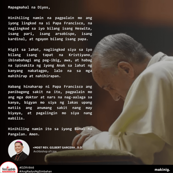 Hinikayat ni Lipa Archbishop Gilbert Garcera ang mga mananampalataya na makiisa sa pananalangin para sa agarang paggaling ng Kanyang Kabanalan Francisco.