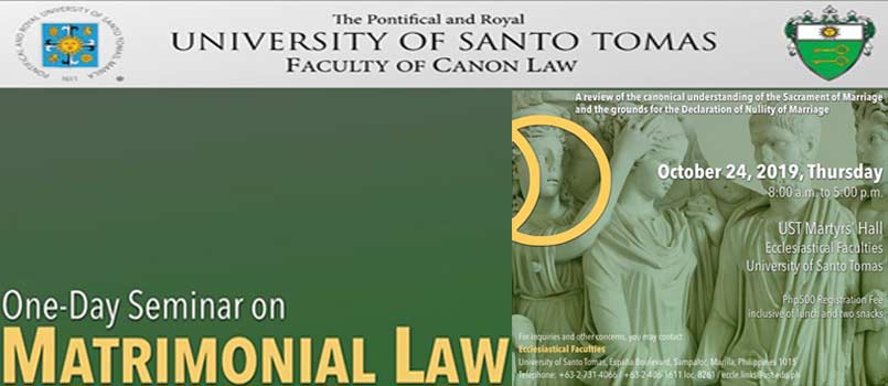 Ang isasagawang seminar tungkol sa Matrimonial Law ay gaganapin sa ika-24 ng Oktubre, araw ng Huwebes mula alas-8 ng umaga hanggang alas-5 ng hapon sa UST Martyrs’ Hall of the Ecclesiastical Faculties, University of Santo Tomas.