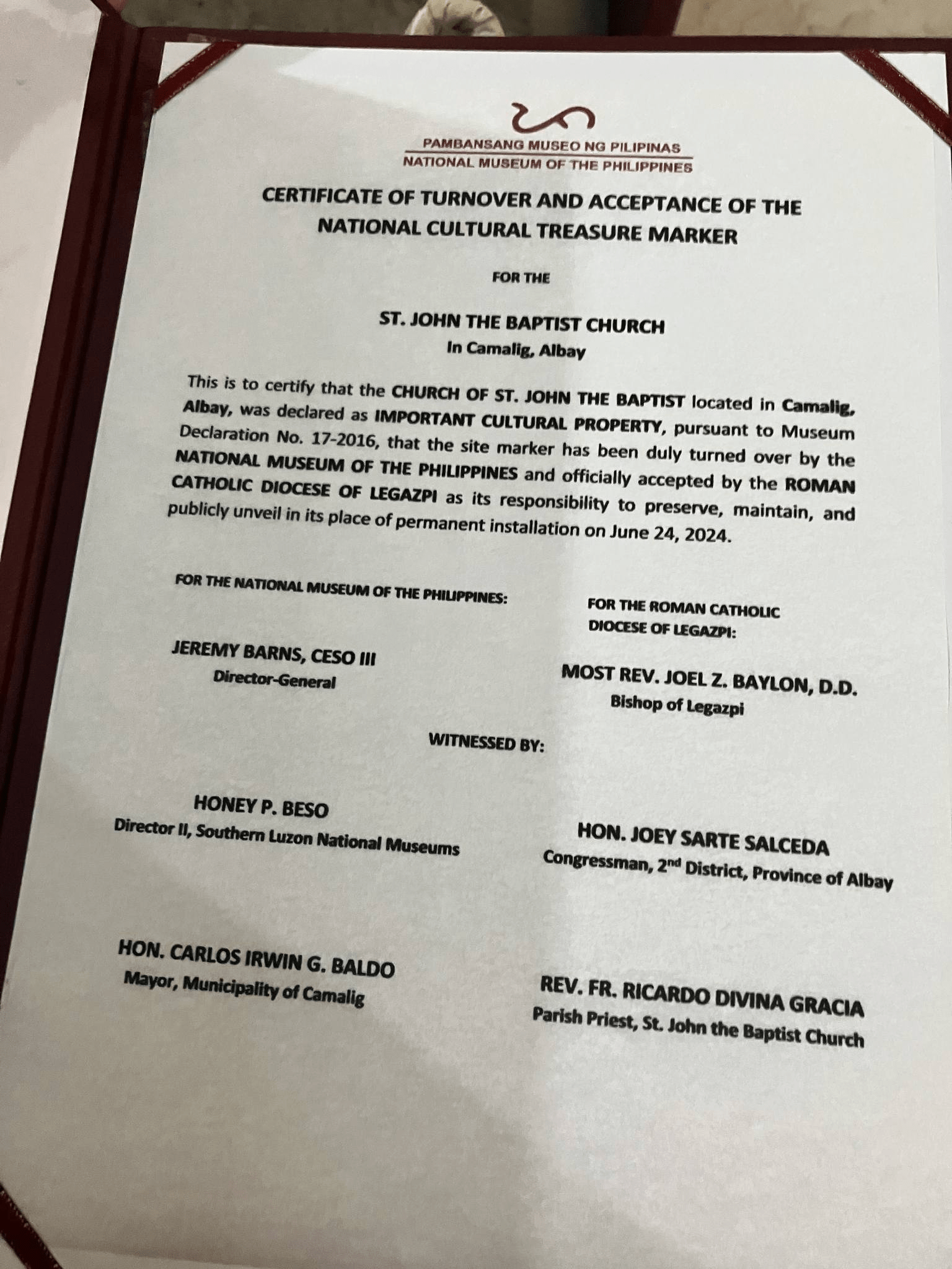 Opisyal na idineklara ng National Museum of the Philippines bilang isang Important Cultural Property ang St. John the Baptist Church sa Camalig, Albay na nasa ilalim ng pangangasiwa ng Diyosesis ng Legazpi.
