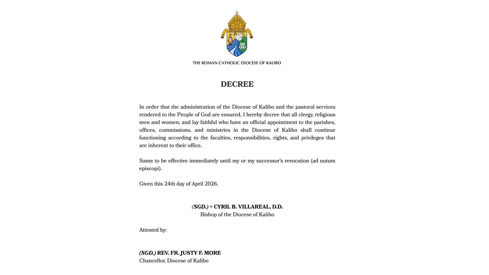 Tiniyak ni Kalibo Bishop Cyril Villareal na magpapatuloy ang pamamahala at paglilingkod para sa pastoral na pangangailangan ng diyosesis sa pamamagitan ng isang opisyal na kautusan kasunod ng kanyang pag-upo bilang ikalimang obispo ng Kalibo.