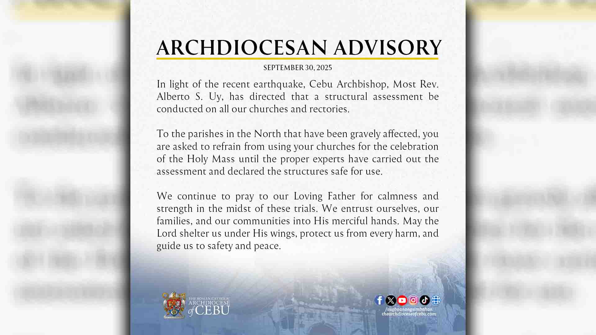 “To the parishes in the North [Cebu] that have been gravely affected, you are asked to refrain from using your churches for the celebration of the Holy Mass until the proper experts have carried out the assessment and declared the structures safe for use,” ayon sa abiso ng arkidiyosesis.
