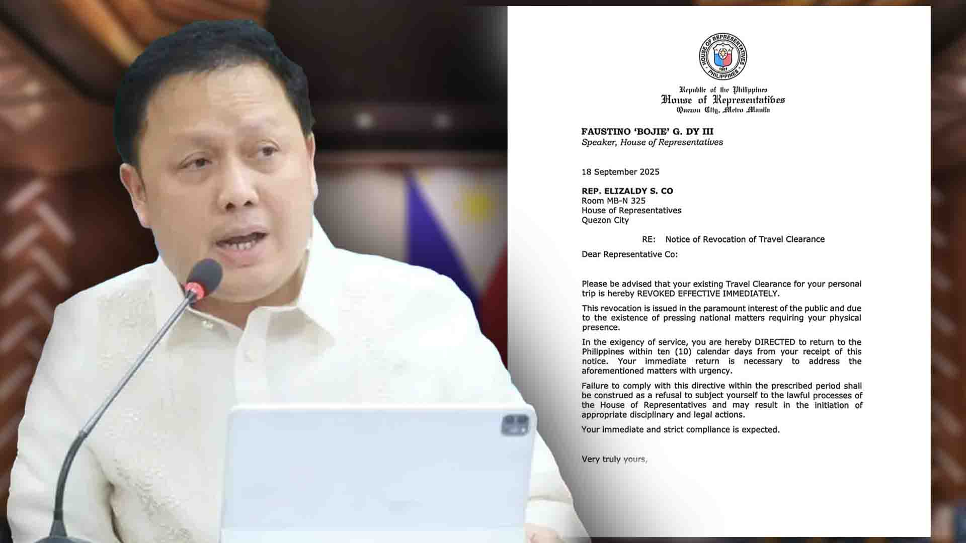 Sa liham na may petsang Setyembre 18, ipinaabot ng bagong pinuno ng Kamara kay Co na ang kanyang travel clearance para sa personal na biyahe ay binabawi na at wala nang bisa.