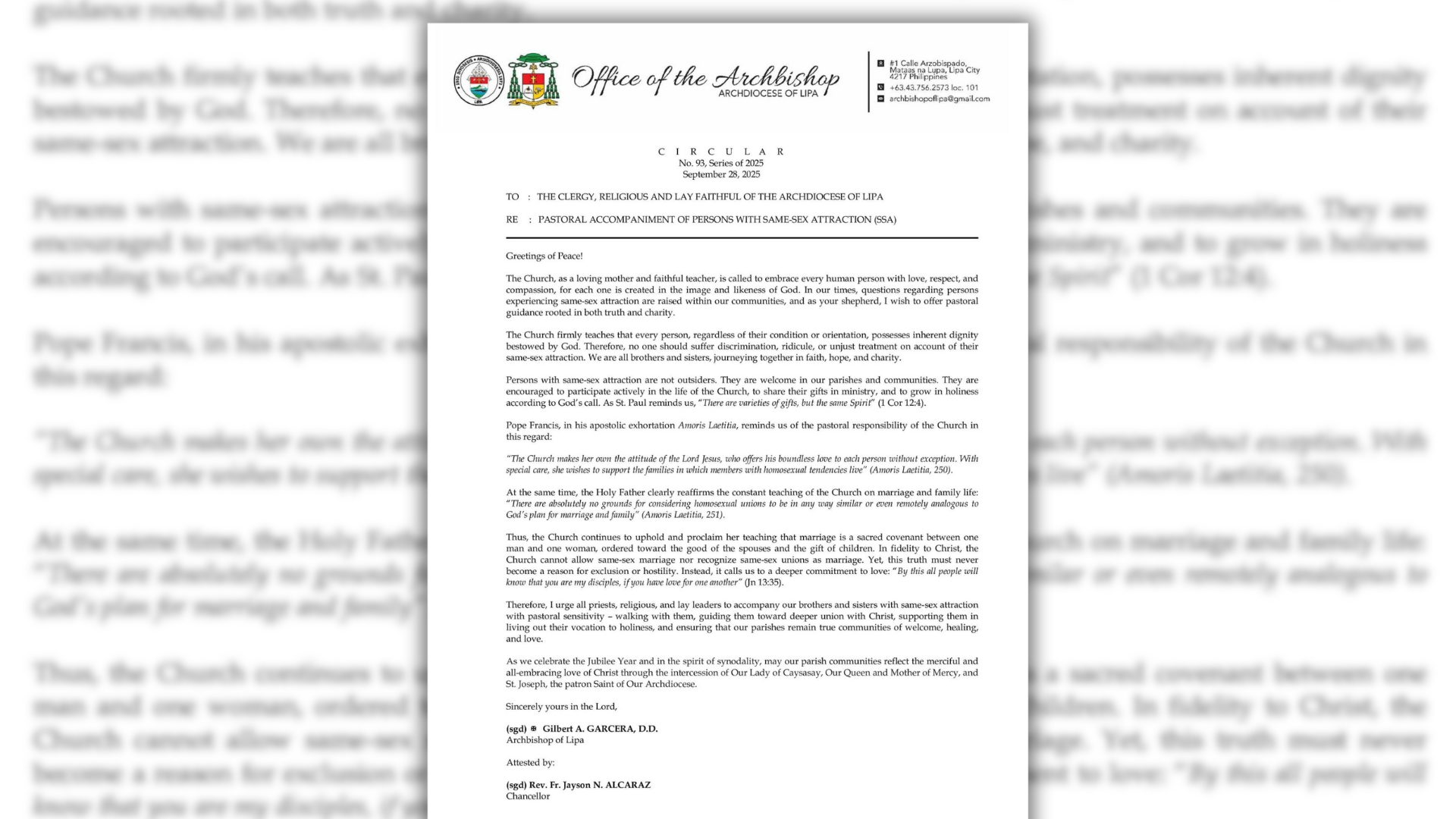 “Persons with same-sex attraction are not outsiders. They are welcome in our parishes and communities. They are encouraged to participate actively in the life of the Church, to share their gifts in ministry, and to grow in holiness according to God’s call. As St. Paul reminds us, “There are varieties of gifts, but the same Spirit” (1 Cor 12:4),” ayon sa Pastoral letter ni Archbishop Garcera na may petsang September 28.