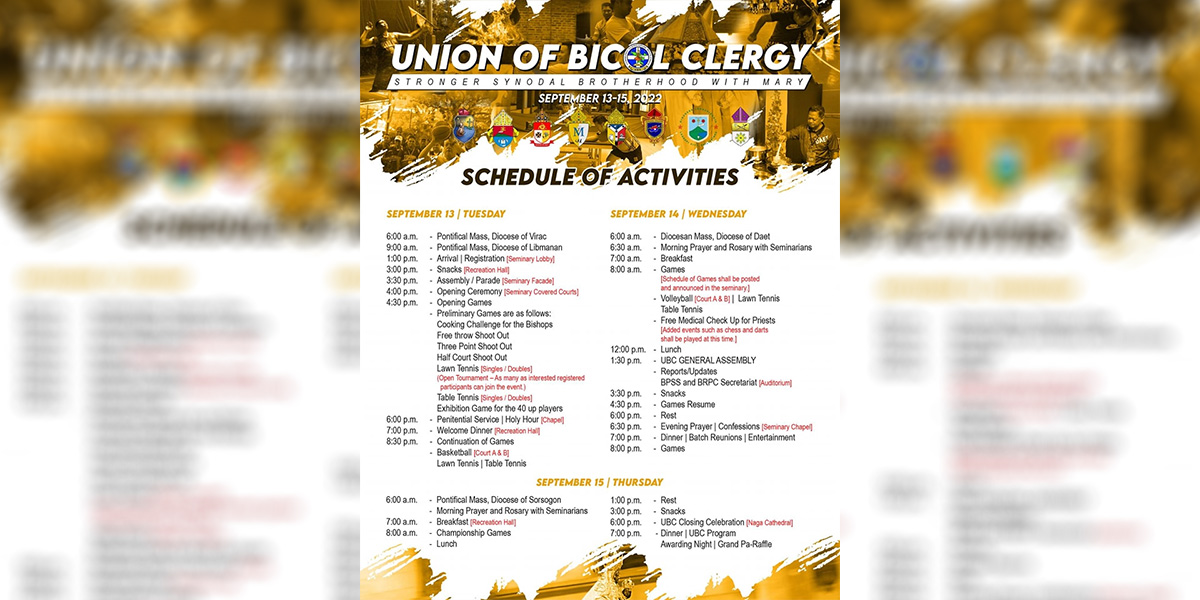 “Eight ecclesiastical jurisdictions united under the Manto of INA, the patroness of Bicolandia, the Union of Bicol Clergy (UBC) is set to commence this September 13 which shall last until the 15th. All Bicolano clerics and clerics currently assigned in these 8 ecclesiastical jurisdictions in Bicol shall gather to celebrate the august feast of the “Reina del Bicol”, Nuestra Señora de Peñafrancia. Three days of prayer, sports and camaraderie towards a “stronger synodal brotherhood with Mary.”pahayag ng Union of Bicol Clergy (UBC).