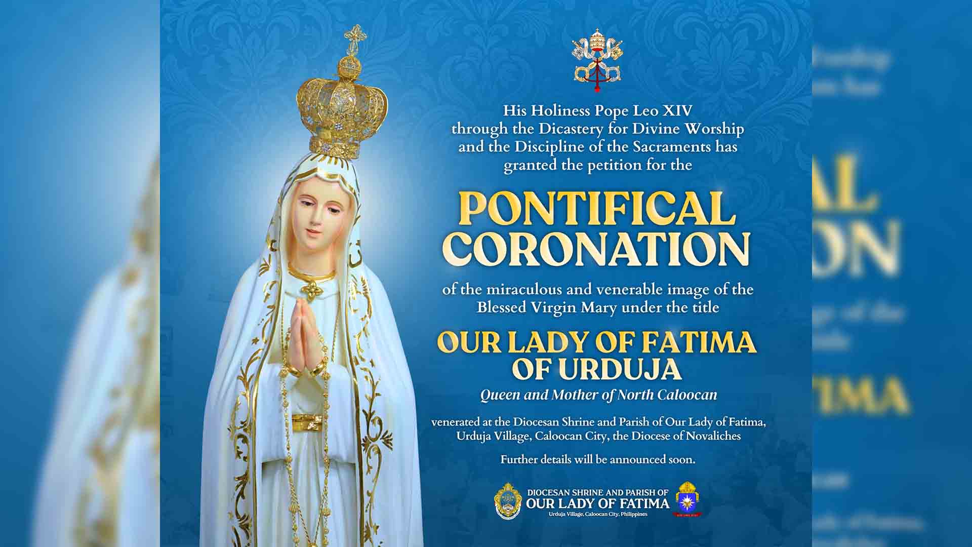 Pinahintulutan ng Vatican ang pontifical coronation sa imahe ng Mahal na Birhen ng Fatima sa Urduja, Caloocan City.