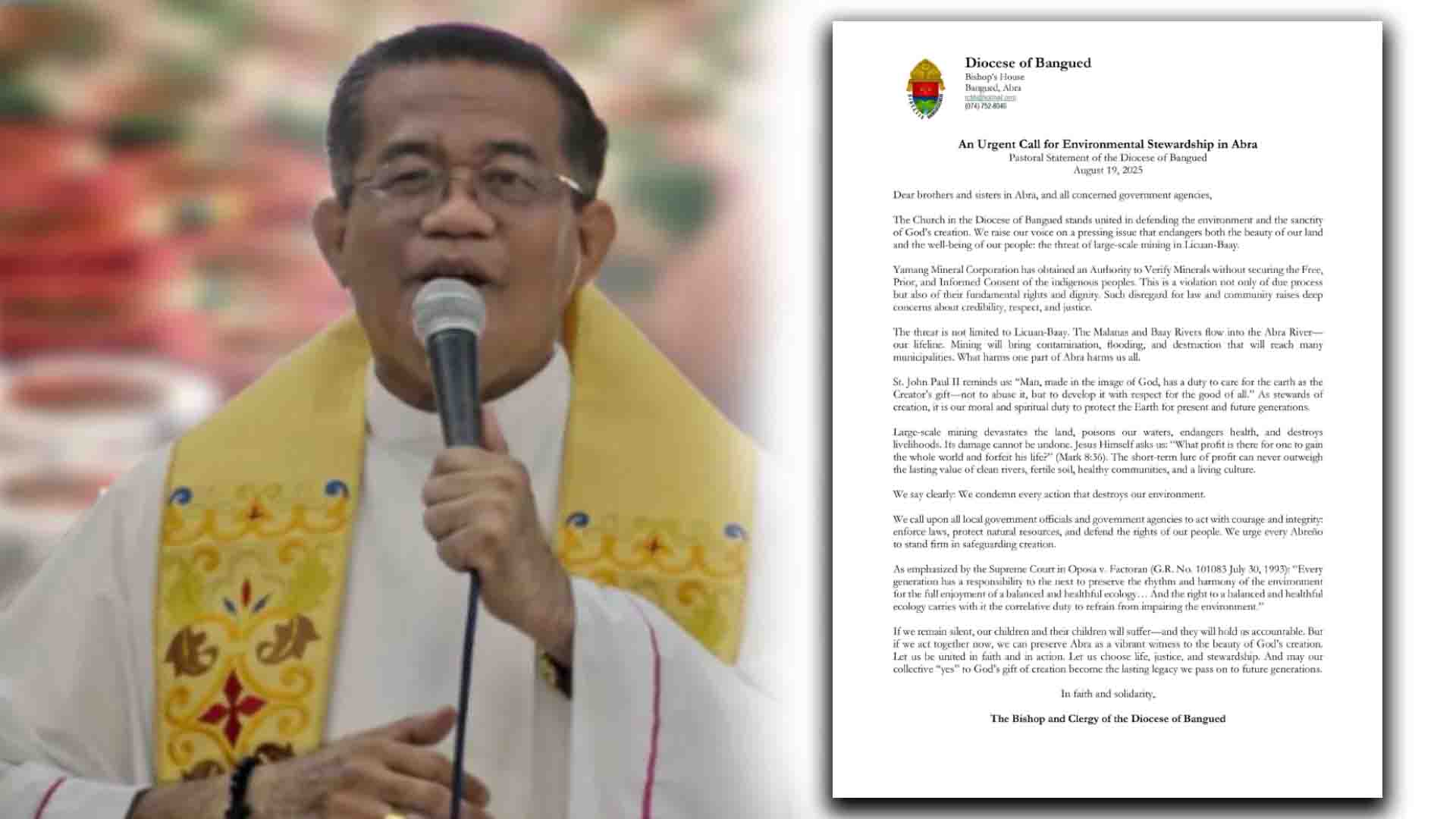 Ito ang binigyang-diin ni Bangued Bishop Leopoldo Jaucian sa kanyang pastoral statement na “An Urgent Call for Environmental Stewardship in Abra,” bilang paninindigan ng Diyosesis ng Bangued laban sa large-scale mining sa lalawigan, partikular sa Licuan-Baay.